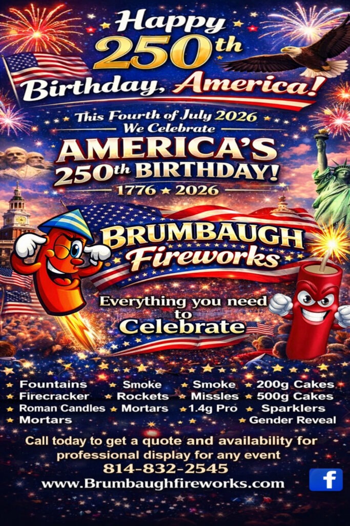 Contact Brumbaugh Fireworks today to find the fireworks you need for your next celebration: (814) 832-2545.